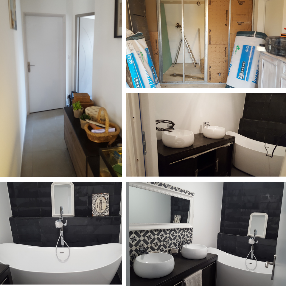 Avant : Après : Transformation d’un garage en salle de bain à La Teste : création d’une ouverture et d’une cloison, pose du carrelage et installation de la plomberie (baignoire, meuble double vasque, évacuations).