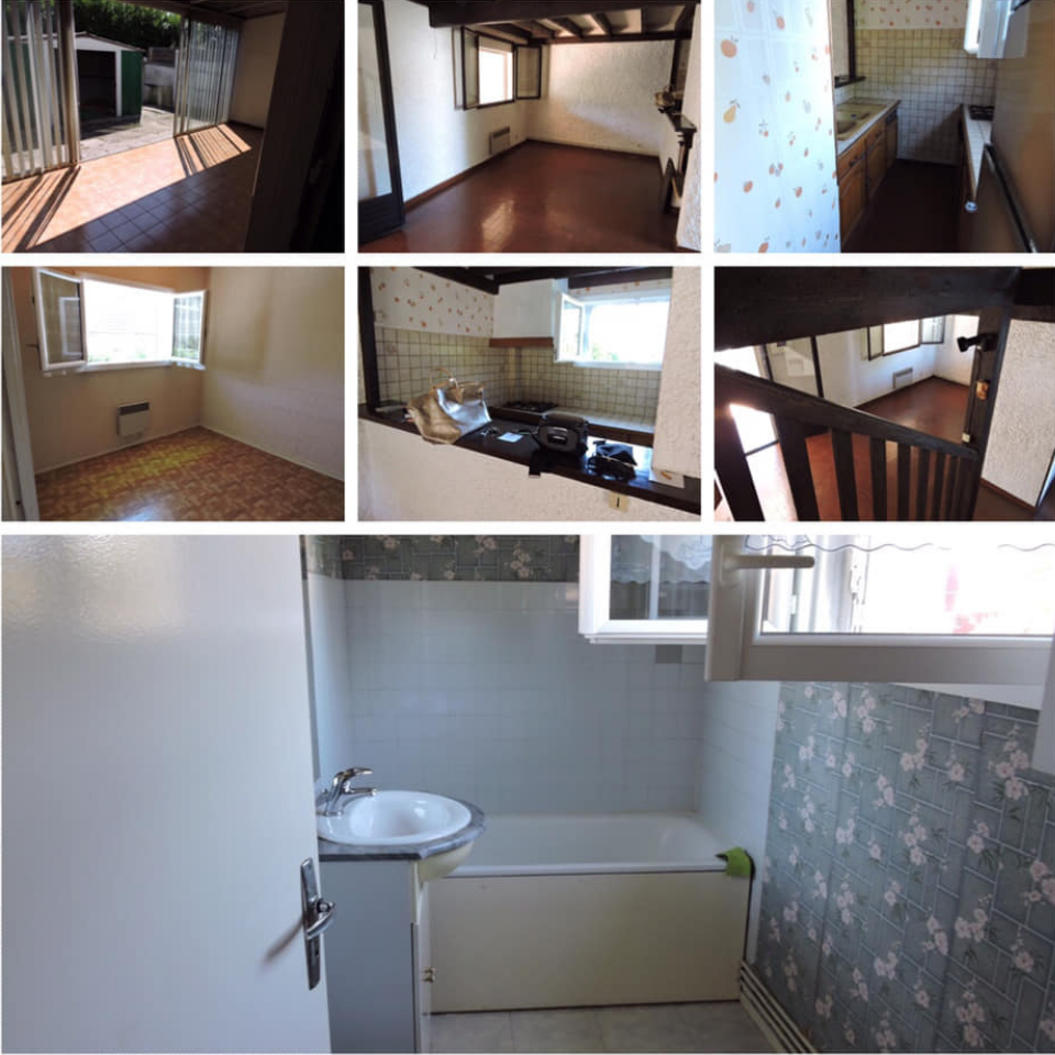Avant – Après : Rénovation de maison à La Teste. Transformation de la salle de bain en salle d’eau, aménagement de la cuisine, de la chambre et du salon.