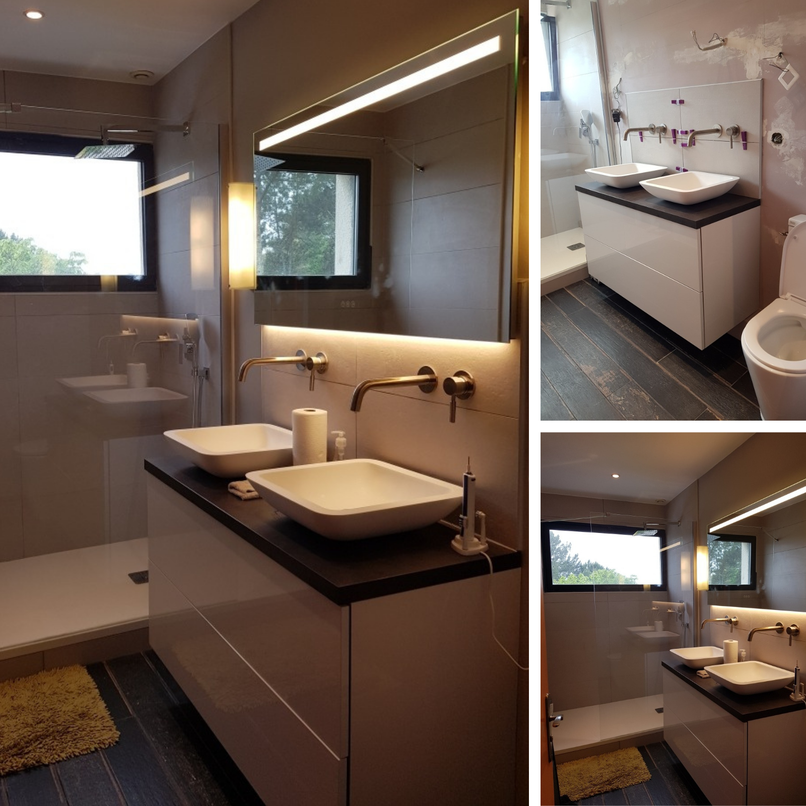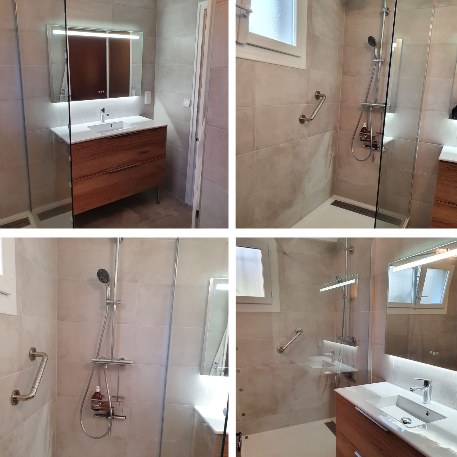 Avant – Après : Transformation d’une salle d’eau à Arcachon : dépose de la cabine de douche et du meuble vasque. Réalisation d’une douche à l’italienne, pose de la faïence murale et du meuble vasque.