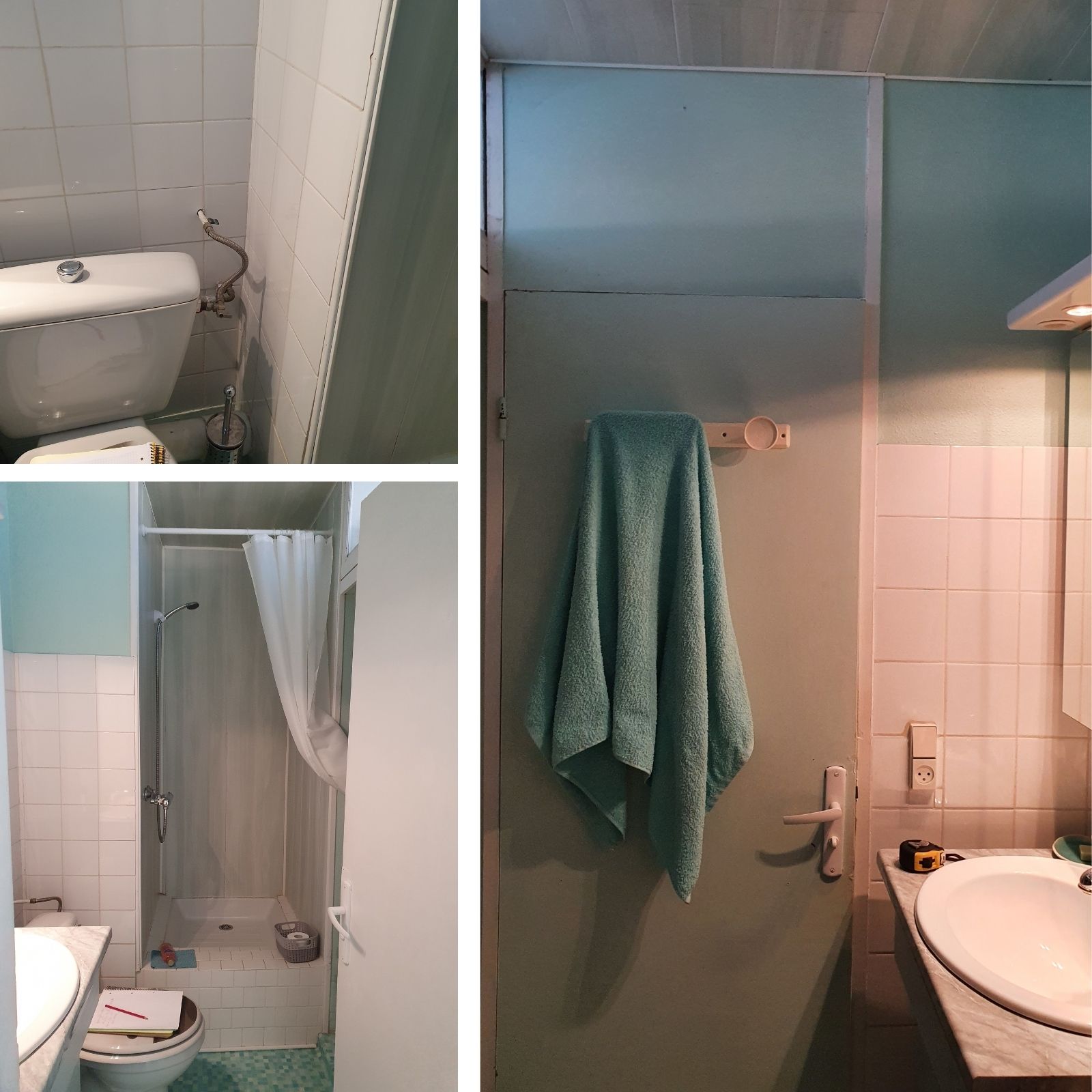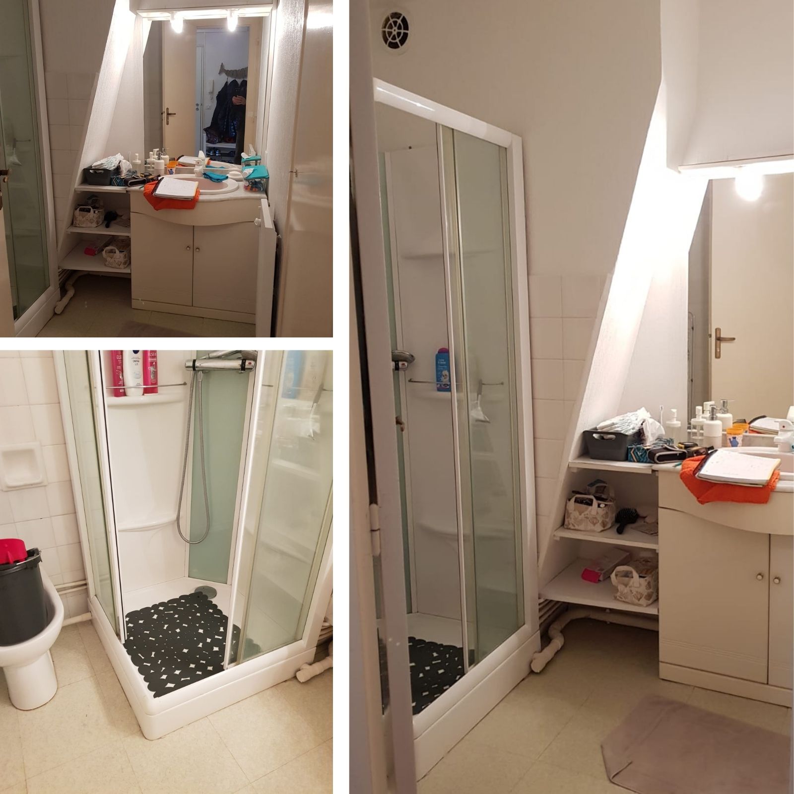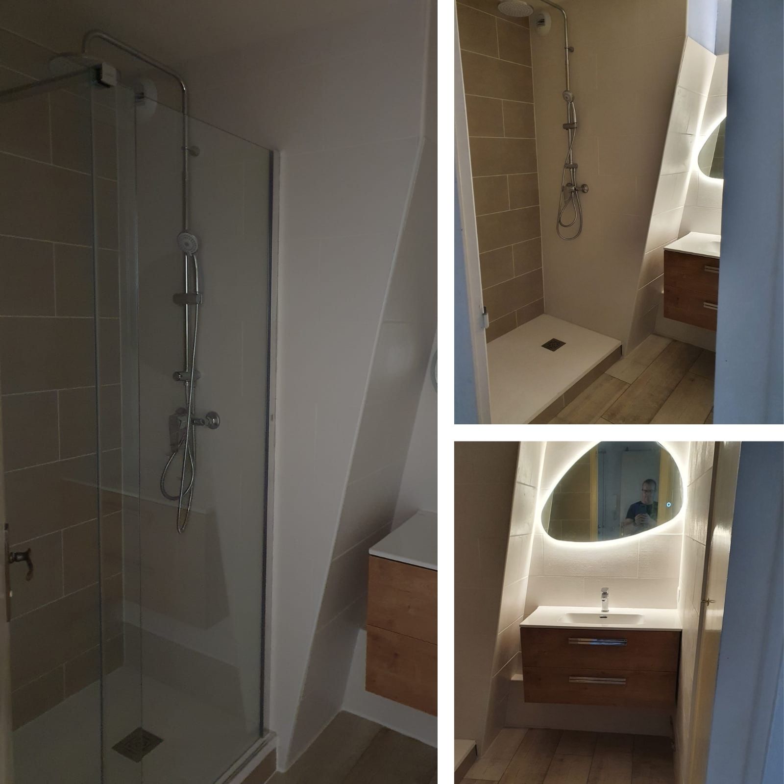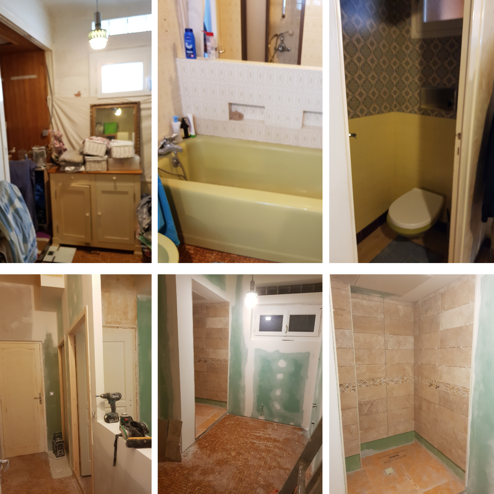 Avant – Après : Transformation de salle d’eau à Arcachon : dépose d’un bac à douche et du mobilier, démolition d’une cloison, agrandissement de la salle d’eau avec un habillage des murs, pose d’un carrelage et reprise des murs et plafond.