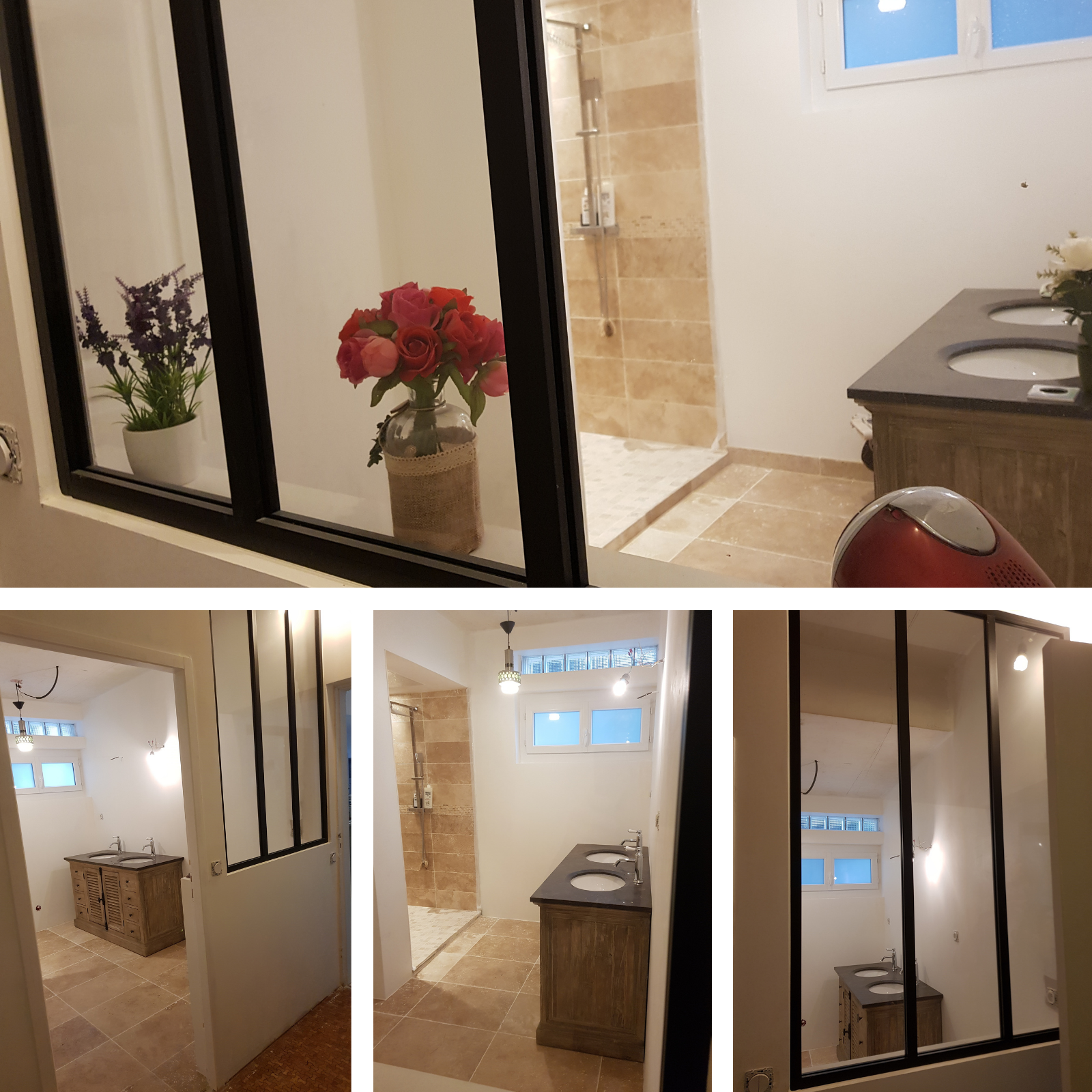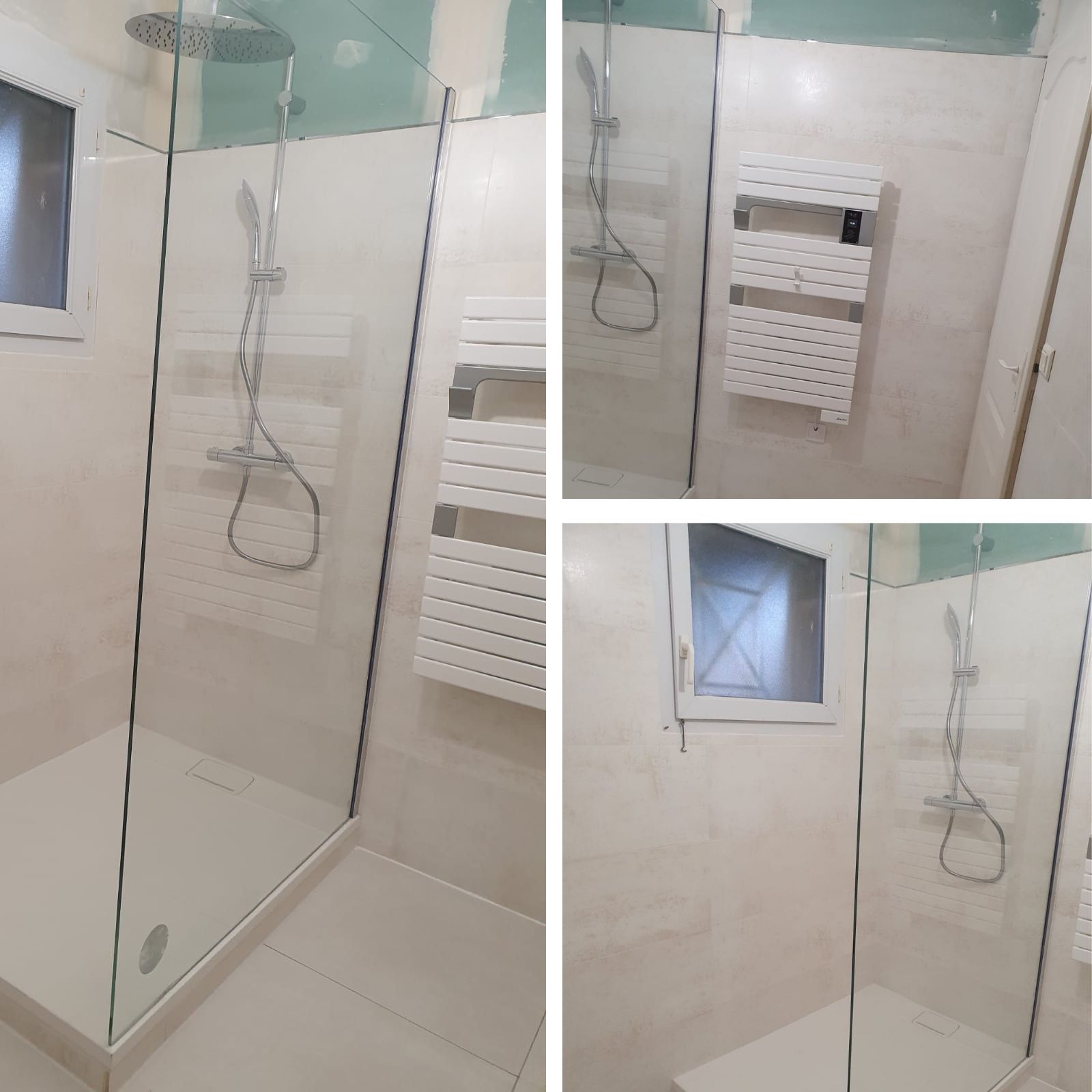 Avant – Après : Transformation d’une salle de bain à Arcachon : dépose de la baignoire et du mobiliers, création d’une douche à l’italienne avec une pose de carrelage et de faïence, installation de la plomberie ainsi que d’une verrière.
